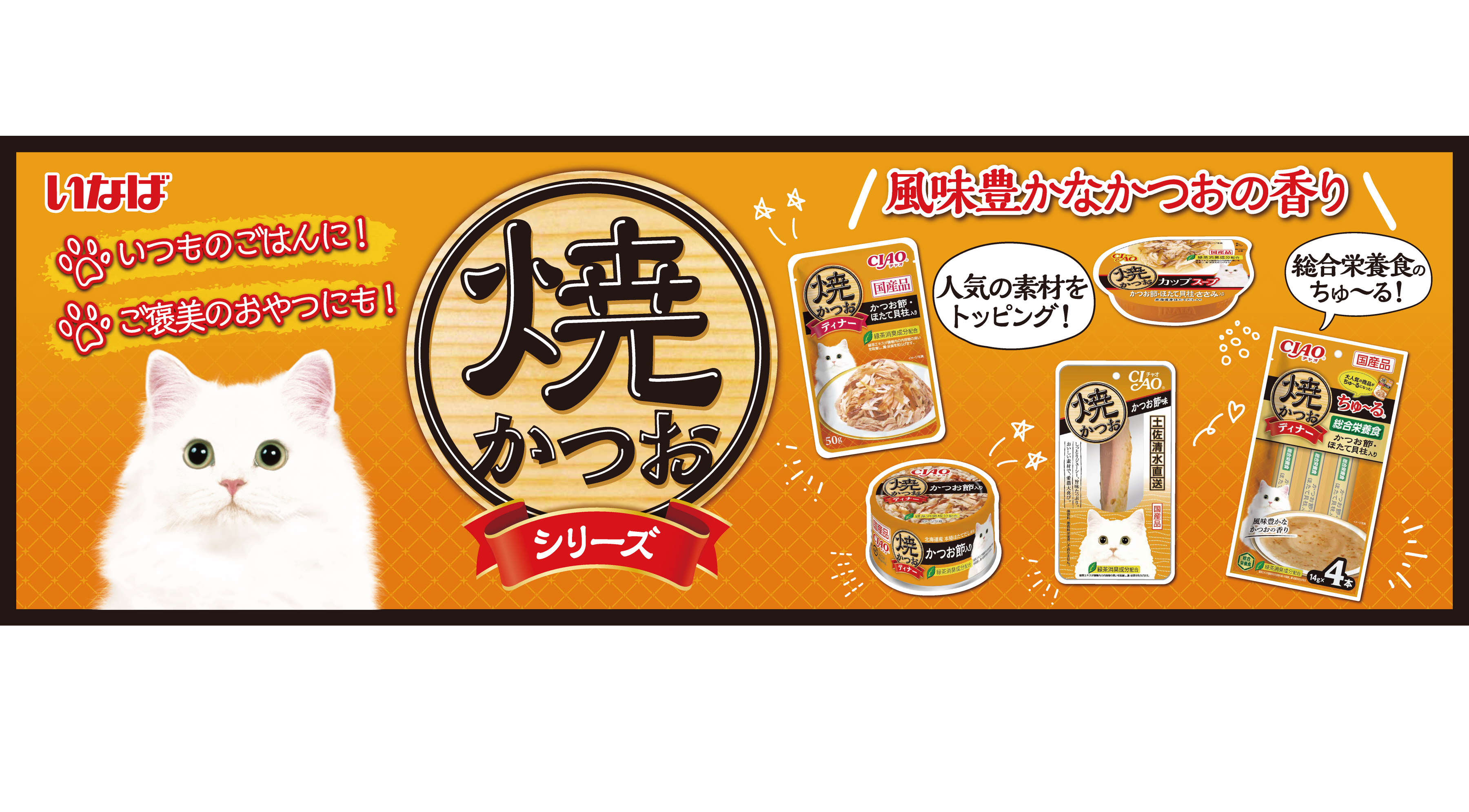 いなばペットフード株式会社(いなば食品グループ) の「焼かつお」シリーズが、日頃よりご愛顧いただいている皆様と多くの猫ちゃんたちのおかげで、この度、発売25周年を迎えることができました。心より感謝申し上げます。