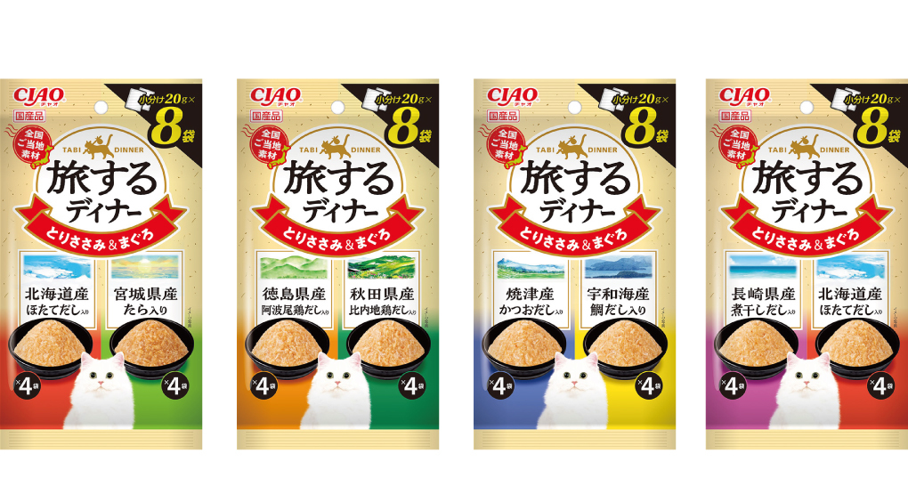 いなばペットフード株式会社は、猫ちゃん用フード「CIAO 旅するディナー」を新発売いたしました。まぐろ、とりささみを全国ご当地の魚介や鶏のだしで仕上げた風味豊かなゼリーで、猫ちゃんとの旅行気分もご満喫いただけます。