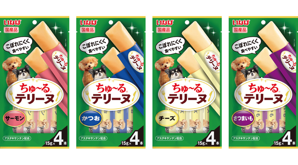 いなばペットフード株式会社(いなば食品グループ)は、わんちゃん向けおやつ「ちゅ~るテリーヌ」の新フレーバー4種を新発売いたしました。わんちゃんが大好きな素材を使ったおやつで、高級感あふれるグルメな風味をお楽しみいただけます。