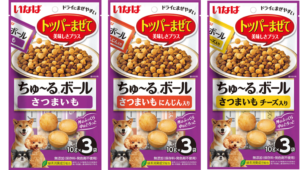 いなばペットフード株式会社(いなば食品グループ)は、わんちゃん向けおやつ「ちゅ~るボール」の新フレーバー3種を新たに発売いたしました。さつまいもの程よい甘さを感じられ、わんちゃんの健康にやさしい食物繊維もたっぷり。外はふんわり、中はトロッと2つの食感をお楽しみいただけます。