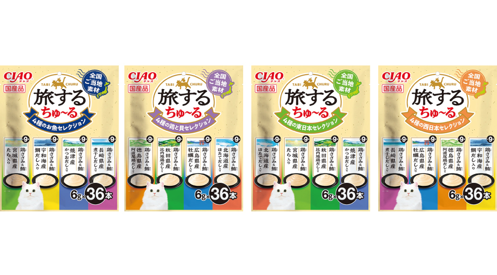 いなばペットフード株式会社(いなば食品グループ)は、ご好評の猫ちゃん用おやつ「CIAO 旅するちゅ~る」シリーズより、36本入りの大容量バラエティパックを新発売いたしました。ご好評をいただいている、全国各地のご当地素材の風味を活かした4種類の味をひとつのパッケージに集約。愛猫が旅気分を味わえる、贅沢なおやつ時間をお届けします。