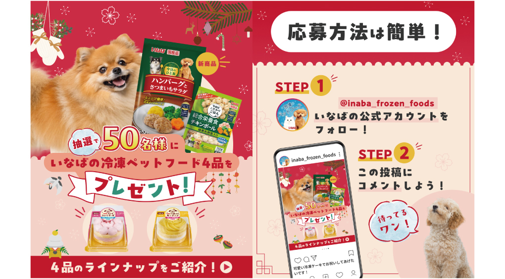 いなばペットフード株式会社(いなば食品グループ)は、日本最大級のペット総合メディア「PECO」とのInstagramタイアップキャンペーンを開始いたしました。本キャンペーンでは、愛犬の健康と美味しさを追求した「いなばの冷凍ペットフード」を無料でお試しいただけるチャンスをご用意いたしました。いなば冷凍ペットフード公式Instagramをフォローし、本キャンペーン投稿にコメントしてくださった方の中から抽選で、50名様に豪華4品セットをお届けいたします。