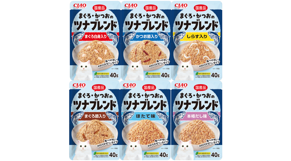 いなばペットフード株式会社(いなば食品グループ)は、猫ちゃん用パウチ「CIAO まぐろ・かつおのツナブレンド」を新発売いたしました。お魚が大好きな猫ちゃんが大満足の素材をブレンドした6種類のフレーバーをラインナップ。食べやすく、中身もスルッと取り出しやすいやわらかゼリータイプの細かめフレークです。