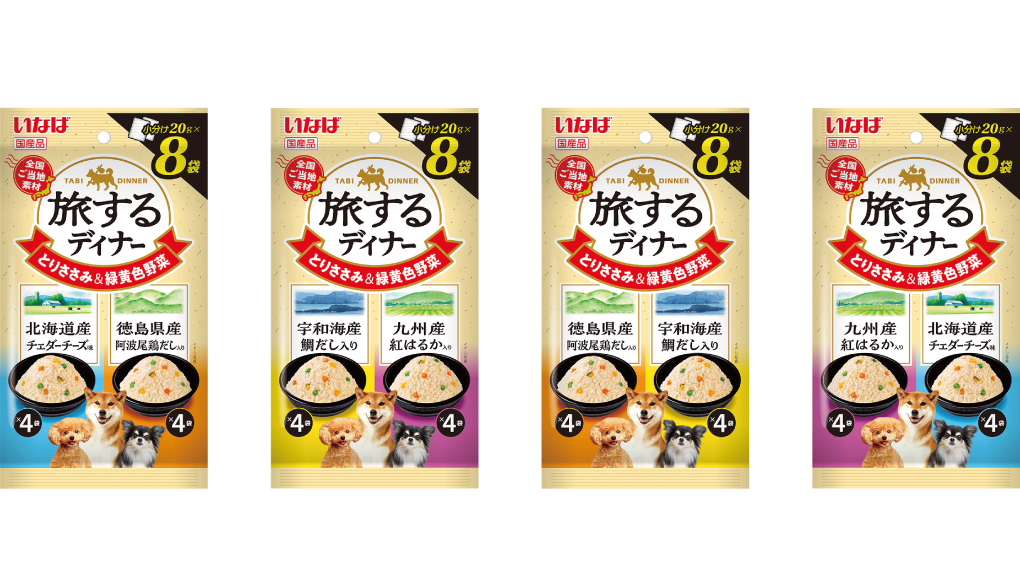 いなばペットフード株式会社(いなば食品グループ)は、わんちゃん用ウェットフードの新作として、こだわりのご当地素材を使用した「旅するディナー」を発売いたしました。全国から選び抜いたこだわりのご当地素材を使用。いつもの食事が楽しい旅行気分で満たされます。