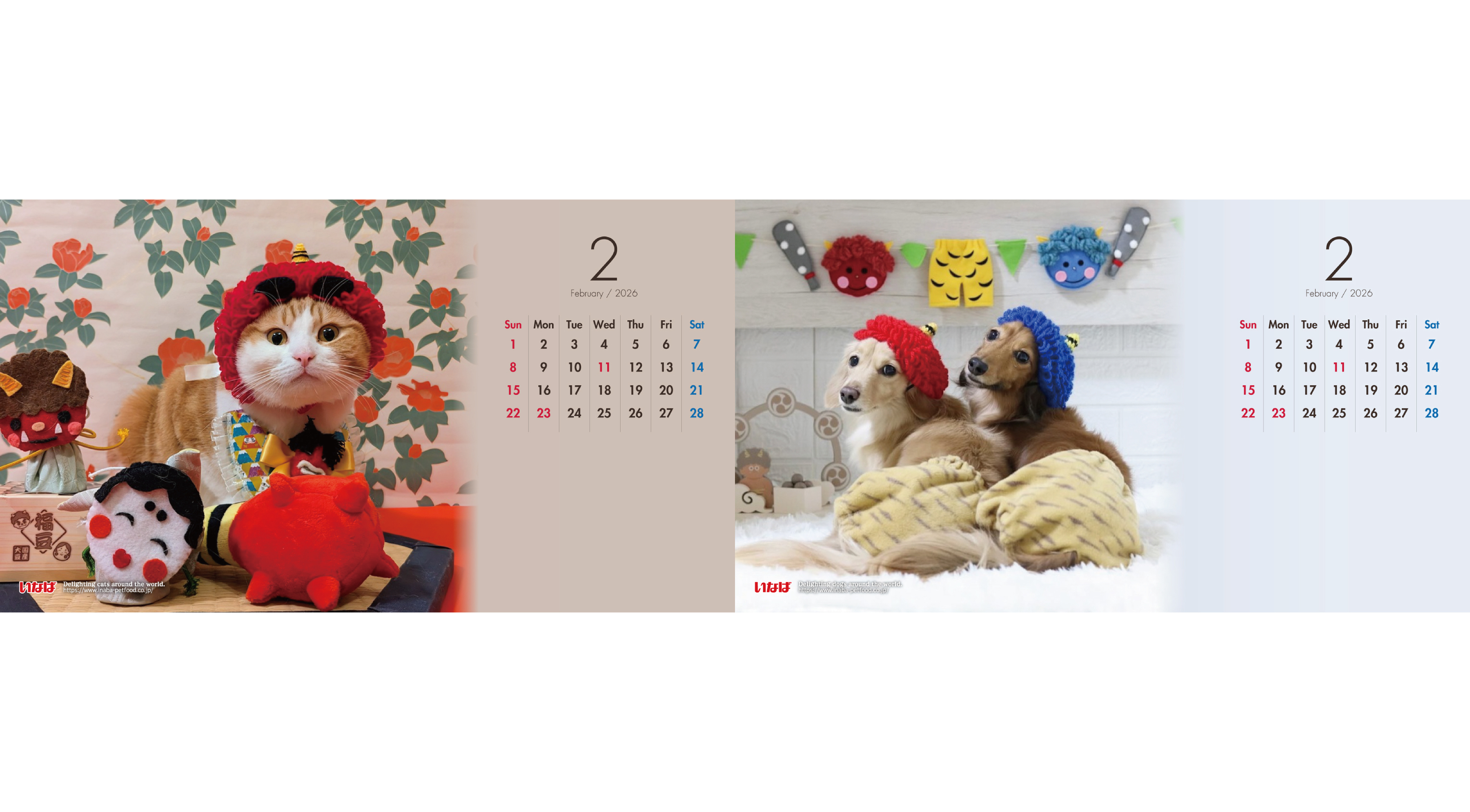いなばペットフード株式会社(いなば食品グループ)は、公式サイト内のお楽しみコンテンツ「ほっと一息」ページを更新し、2026年2月版の「わんちゃん・猫ちゃんカレンダー」を公開いたしました。2月テーマ「節分」にちなんだ採用作品は、かわいらしい鬼の帽子をかぶった姿に思わずほっこり。「ほっと一息」からご自由にダウンロードしてお楽しみください。