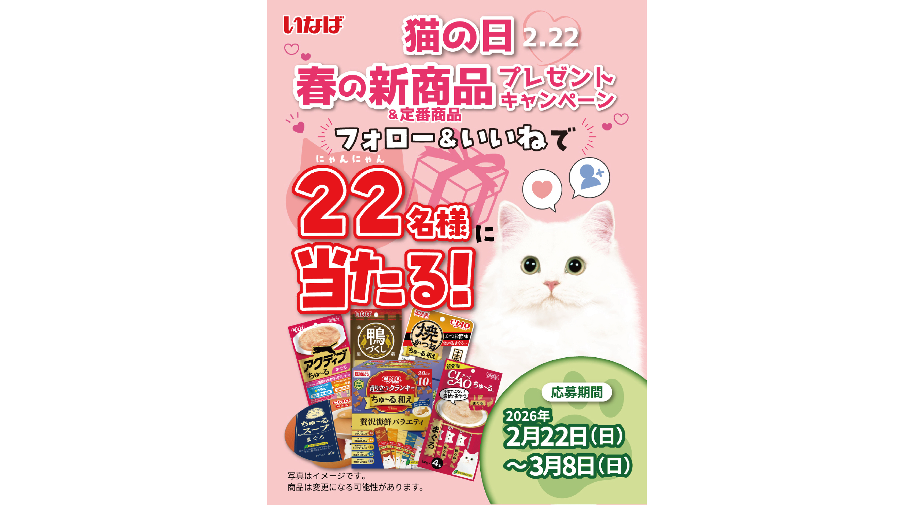 いなばペットフード株式会社(いなば食品グループ)は、「猫の日」の2026年2月22日(日)~3月8日(日)、Instagramで春の新商品&定番商品プレゼント企画を実施しております。抽選で22名様に、猫ちゃん向けの豪華アイテムをプレゼントいたします。どなたでも簡単なステップでご応募いただけますので、この機会にぜひご参加ください。