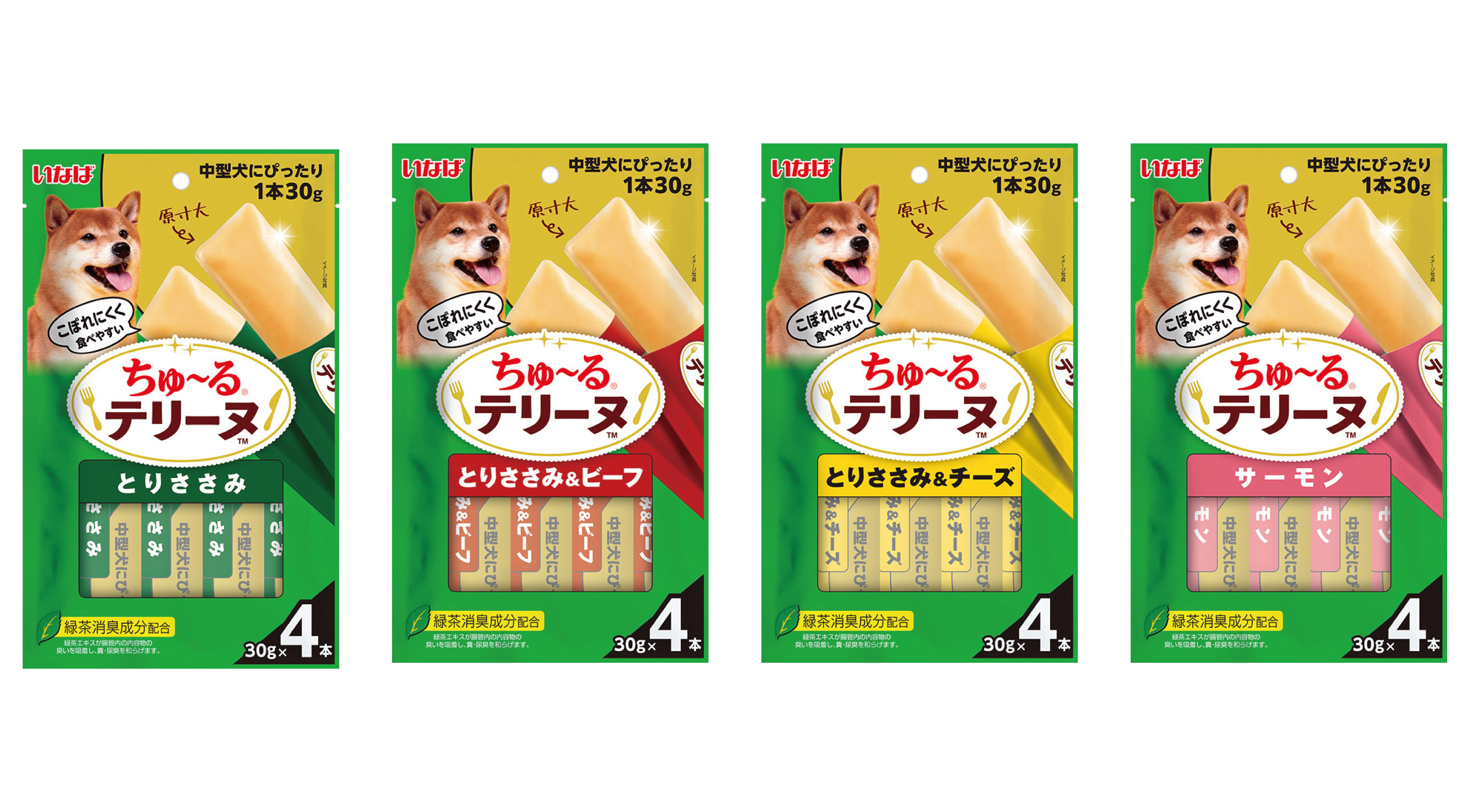 いなばペットフード株式会社(いなば食品グループ)は、 わんちゃんのおやつ「ちゅ~るテリーヌ 中型犬用」を新発売いたしました。30g×4本入りで、中型犬にぴったりのボリューム!「とりささみ」「とりささみ&ビーフ」「とりささみ&チーズ」「サーモン」の4種類をご用意しております。