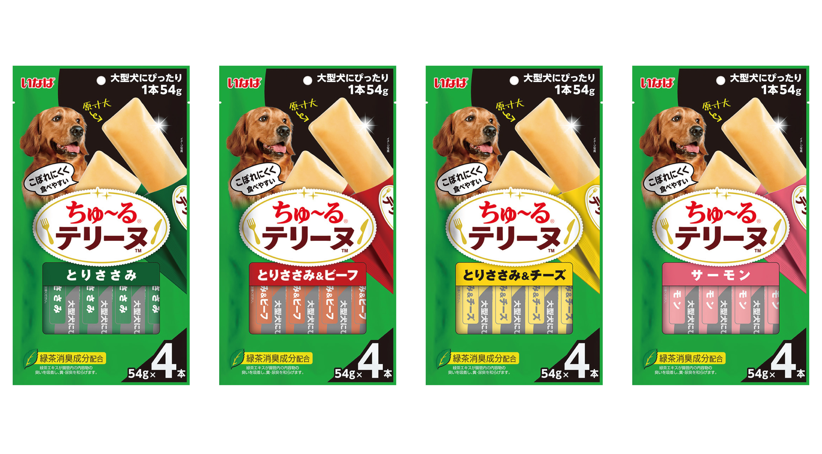 いなばペットフード株式会社(いなば食品グループ)は、食べ応えたっぷりのわんちゃん用おやつ「ちゅ~るテリーヌ 大型犬用」を新発売いたしました。54g×4本入りで、大型犬も大満足のビッグサイズ!「とりささみ」「とりささみ&ビーフ」「とりささみ&チーズ」「サーモン」の4種をラインナップしております。